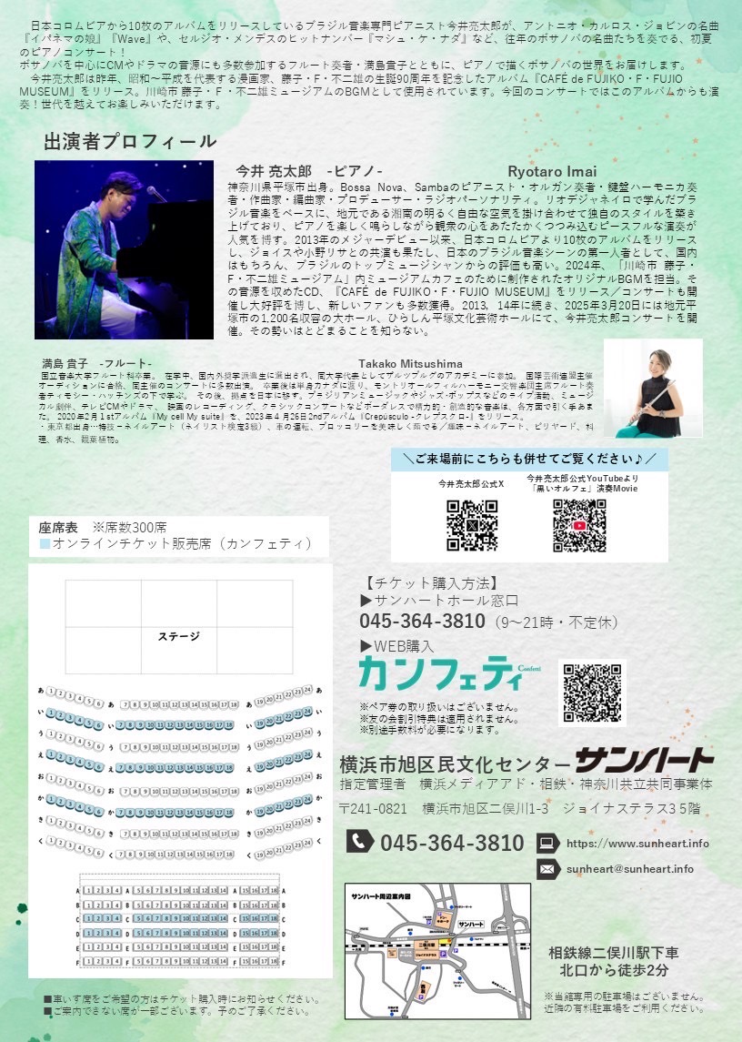 今井亮太郎が、アントニオ・カルロス・ジョビンの名曲「イパネマの娘」「Wave」や、セルジオ・メンデスのヒットナンバー「マシュ・ケ・ナダ」など、往年のボサノバの名曲たちを奏でる、初夏のピアノコンサート!